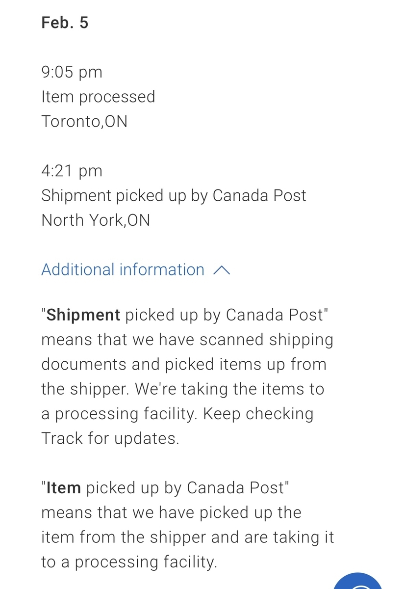 メール内リンクからCanada Postの追跡サイトに飛びます。この時点ではまだ送り伝票作成段階とのこと。